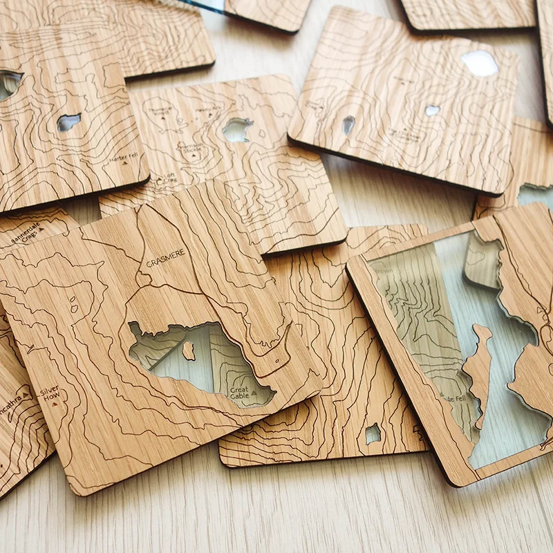 Of Alp & Ash is a business that celebrates outdoors adventure with its laser-cut coasters that are ideal for resting a cuppa/pint on after a day in the mountains. Contoured Coasters are cut from oak veneered plywood, with precision-cut acrylic to represent any bodies of water. They also depict 50m contours, popular summits, roads & place names, and are highly accurate to a scale of 1:25000. Lake District designs came first but the range has since expanded to cover seven other areas in the UK that are popular with walkers, alongside sets of The National Three Peaks & The Yorkshire Three Peaks.